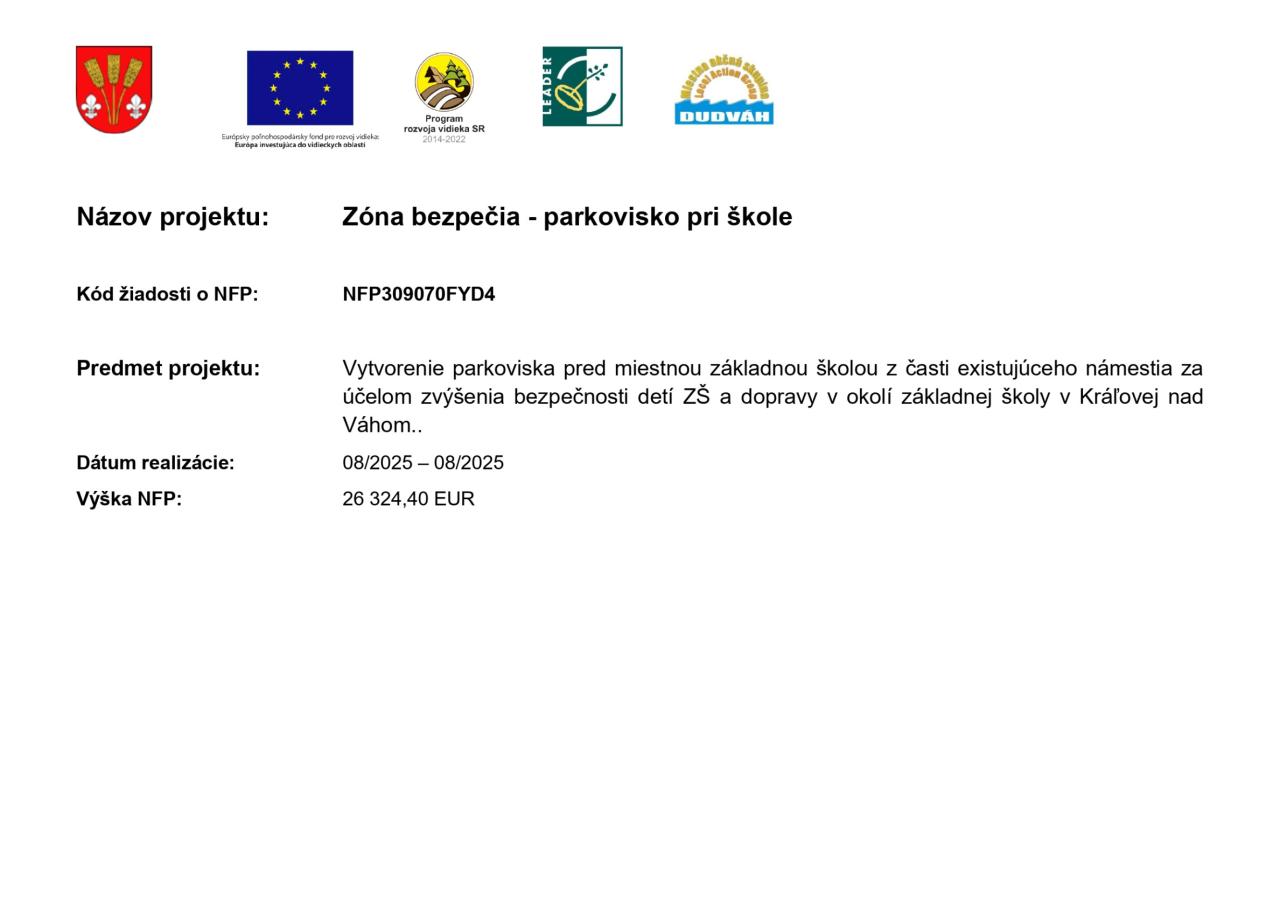 informačná tabuľa_Kráľová nad Váhom.pdf Typ: PDF dokument, Veľkosť: 179.79 kBV rámci projektu Zóna bezpečia sa realizovalo parkovisko pred miestnou základnou školou. Tento projekt, financovaný z dotácie vo výške 26 324,40 EUR, má za cieľ zvýšiť bezpečnosť detí a zlepšiť situáciu s dopravou v blízkosti školy. Vytvorenie parkoviska prispeje k lepšiemu organizovaniu dopravy a zníženiu rizík spojených s pohybom vozidiel v okolí školy, čím sa zabezpečí bezpečnejšie prostredie pre žiakov miestnej základnej školy.